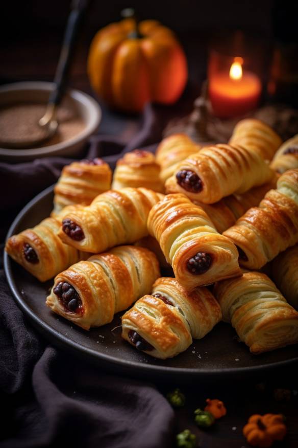 Jetzt sind die gruselig leckeren Halloween Finger aus Blätterteig bereit, um serviert zu werden. Viel Spaß beim Gruseln und Genießen!