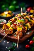 Die Garnelen abwechselnd mit den Paprika- und Gurkenstücken auf Spieße stecken.