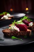 Den Zahnstocher durch das Häppchen stecken und auf einem Servierteller arrangieren.